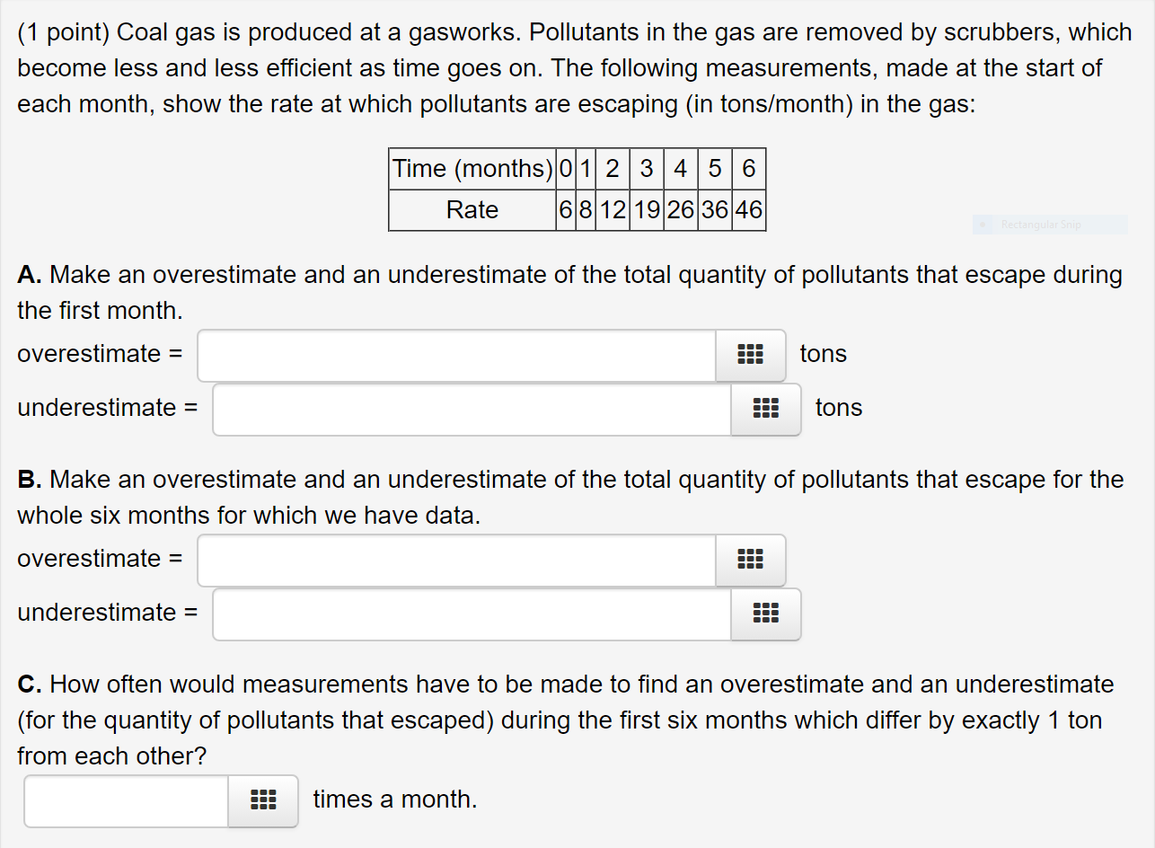 . Make an overestimate and an underestimate of the total quantity of pollutants that escape during the first month. Thefollowing measurements made at the start of each month show the rate at which pollutants are escaping in tonsmonth in the gas. Coal gas is produced at a gasworks Pollutants in the gas.