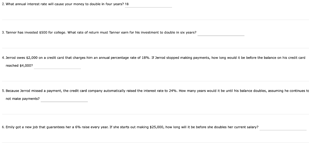 We use 106 because it. If she started out making 40000 how long will it be before she doubles her current salary. Ron and Amie invested 5000 in an educational savings account for their daughter when she was born.
